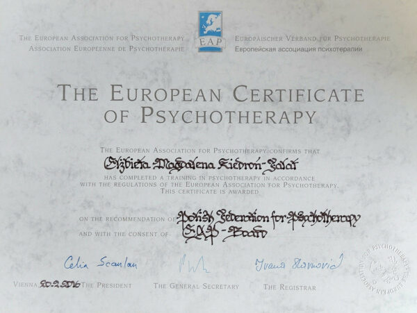 W 2016r. otrzymałam Europejski Certyfikat Psychoterapii The European Certificate of Psychotherapy (ECP) wydawany przez Europejskie Stowarzyszenie Psychoterapii. ECP jest wskaźnikiem ogólnoeuropejskiego standardu psychoterapii.